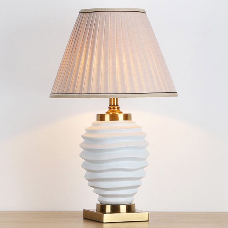 Tiered Vase Night Lamp - Traditional Ceramic 1 Head Bedroom Nightstand Light, Black/White, with Pleated Fabric Shade