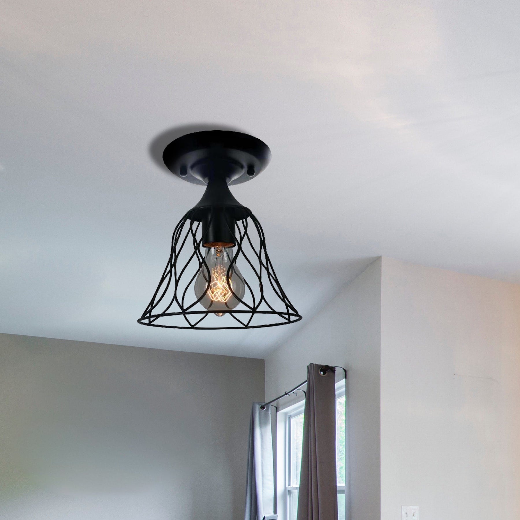 This 1 Bulb Ceiling Lighting Antique Bell Cage Shade Metallic Semi Flush Pendant Light is a beautiful piece to add to the look and feel of your bedroom. This fixture is made with a durable metal material and is designed with an industrial style in a fabulous black color. A great feature of this product is that it is compatible with bulbs of all types - LED, incandescent, and fluorescent giving you great lighting versatility. On top of that, it supports both 220V-240V and 110V-120V voltages ensuring compatibility around the world.
