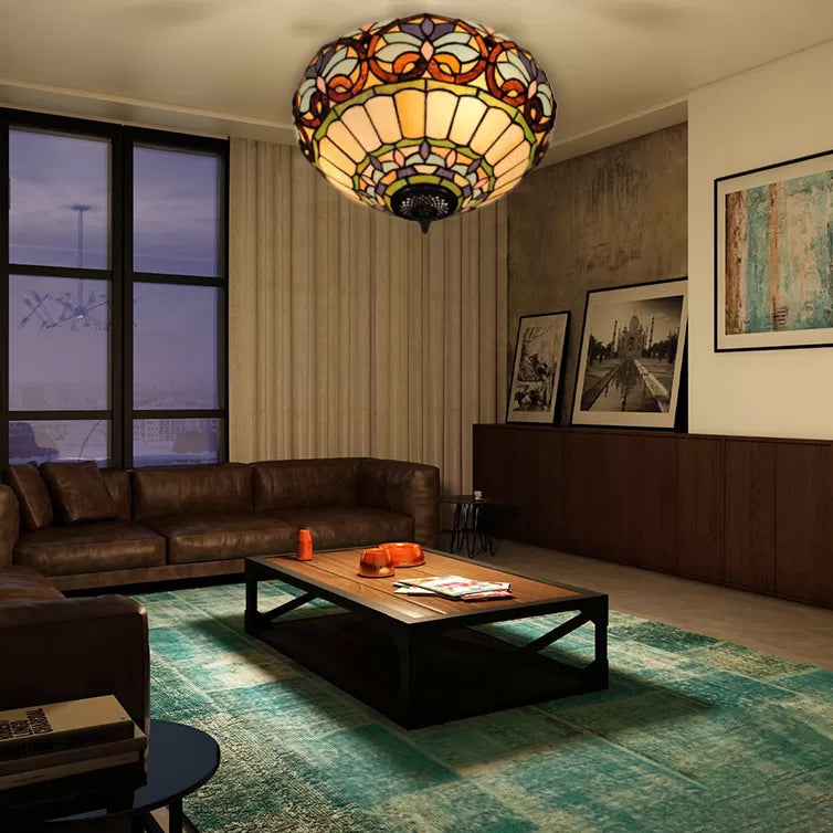 Antique Brass Floral Stained Glass Ceiling Light - Victorian Style Flush Mount Fixture for Living Room (2 Lights)