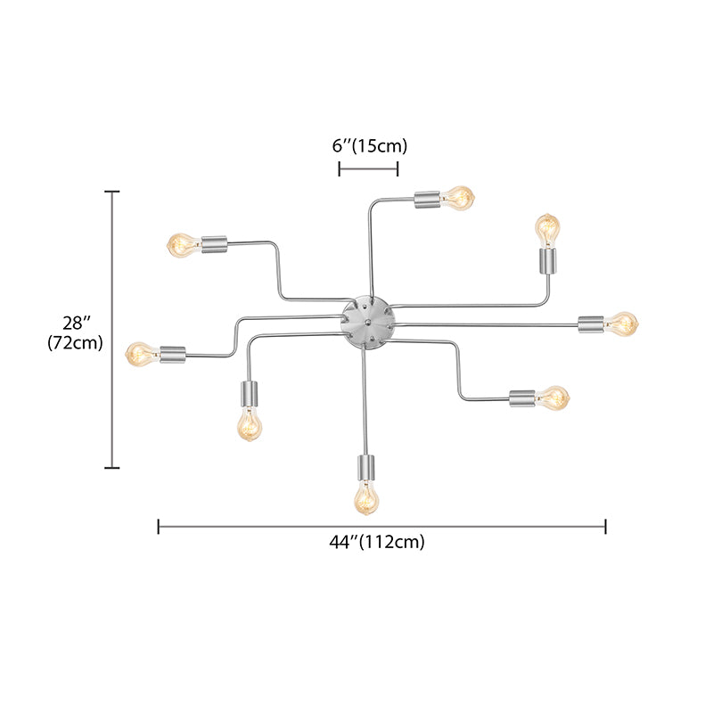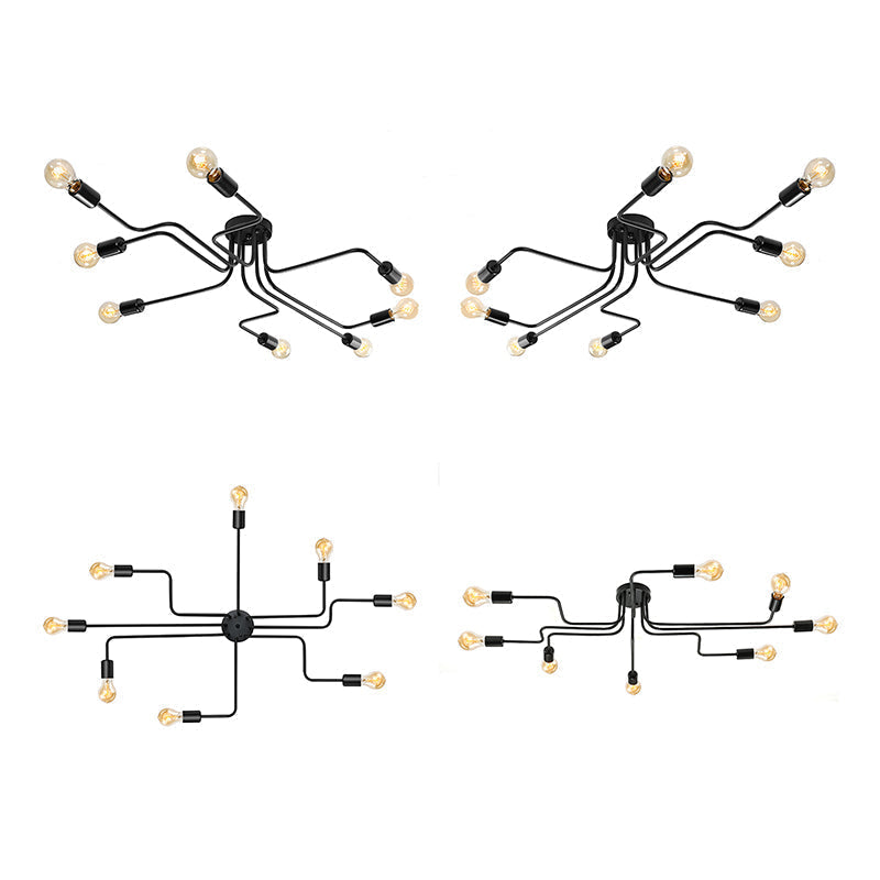 This is a vintage exposed ceiling light in the style of a Sputnik design. It comes in antique brass or black, and is made of metal. There are 4 or 6 lightbulbs, which are not included, and the light fixture is semi-flush mount. The canopy width is 5 inches. The voltage is either 110-120V or 220-240V. The bulb base is E26/E27. The light type can be LED, incandescent, or fluorescent.