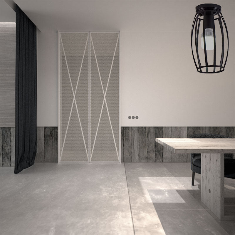 This product is an industrial-style ceiling light with a metal cage shade. It is black in color and has a built-in LED light. It is designed for use in the bedroom and has a voltage of 220V-240V. It is also available in 110V-120V.