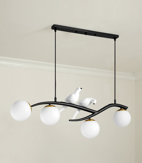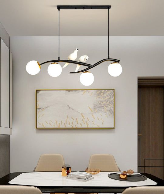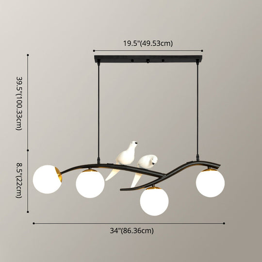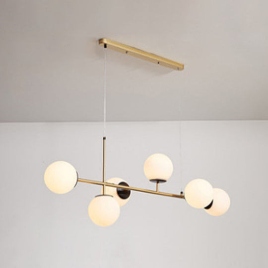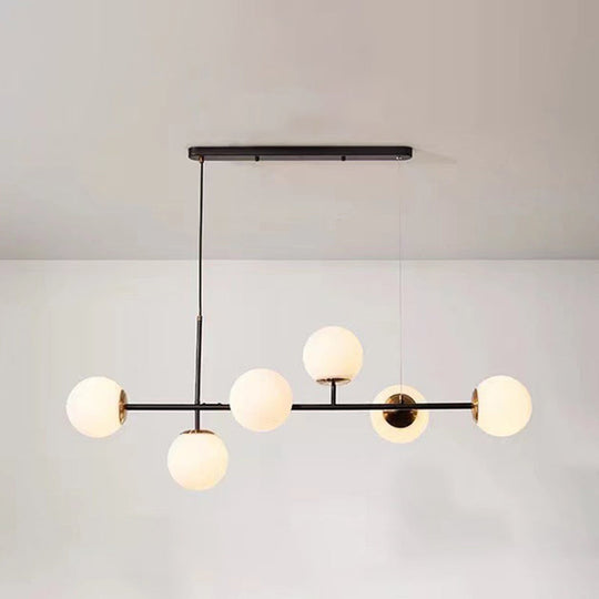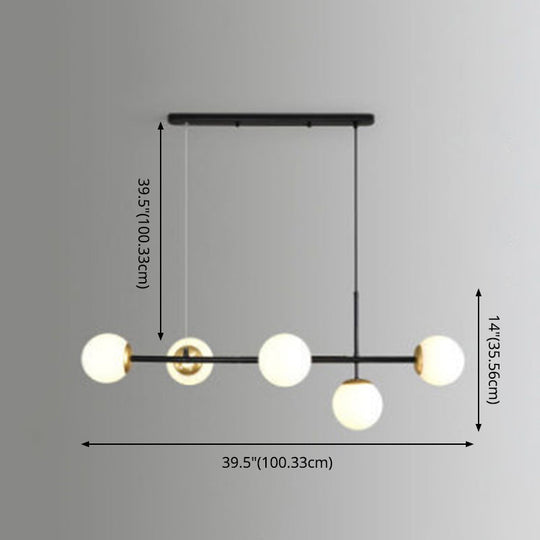 This modern minimalistic linear island ceiling light with a spherical glass shade pendant light is perfect for dining rooms, kitchens, and other living spaces. It features a unique design and is sure to make a great statement in any room. The light is crafted of metal and is available in black or gold. It comes with an adjustable chain that is 39.5" in length and can be used to hang the light from a higher or lower ceiling.