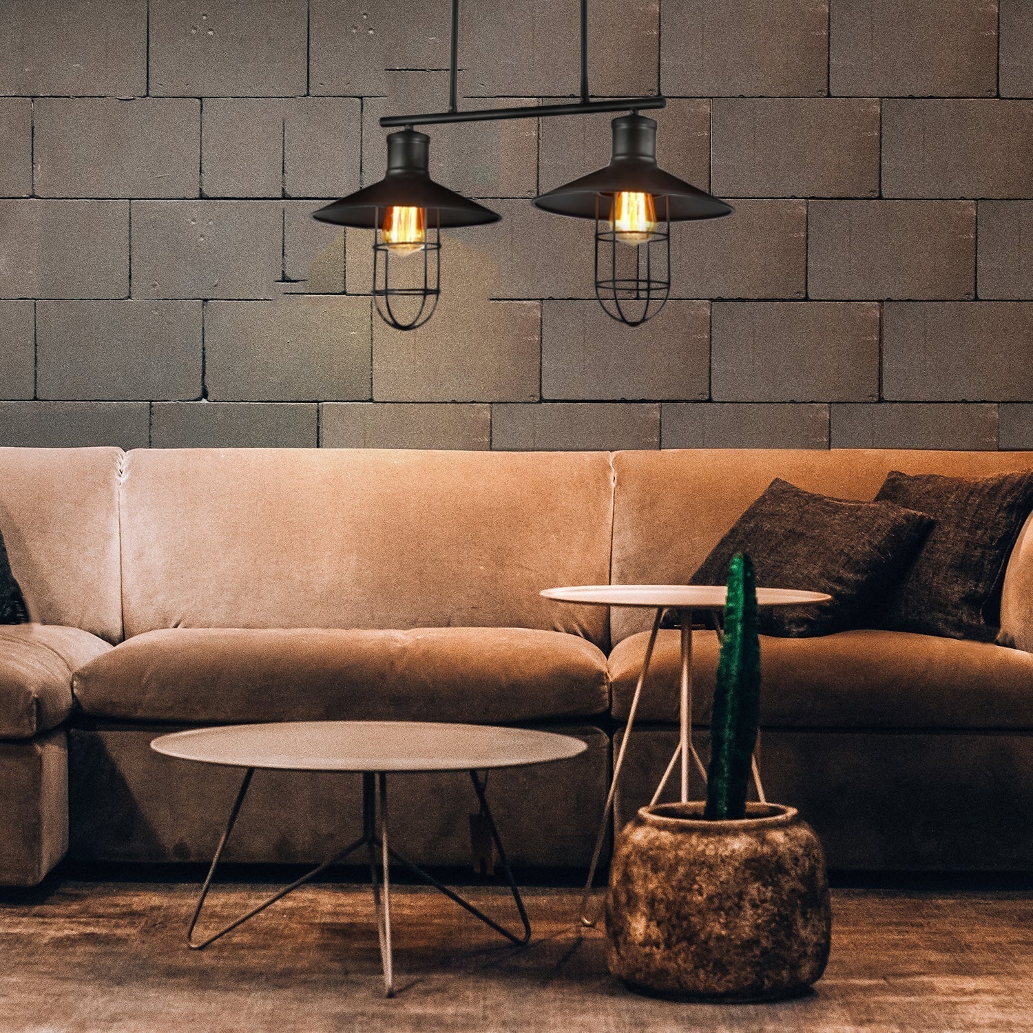 This product is a 2/3-head island lighting pendant lamp with a metallic wire cage shade in black. It is made of metal and has a voltage of 220V-240V. The bulb base is E26/E27, and the light type can be either LED, incandescent, or fluorescent. The fixture width is 39", the fixture height is 12", and the chain/cord length is 39". The length of the product is 10.5", and the width is 25.5". This product is industrial style and is perfect for over table lighting.