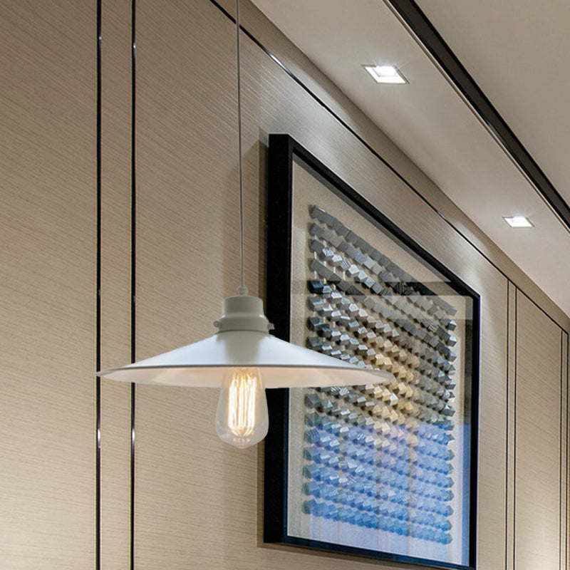 This product is a 1 light metal pendant lamp with a vintage industrial look. The lamp has a flared shade and is available in black, white, or bronze. The light is compatible with LED, incandescent, or fluorescent bulbs. It has a hanging design and can be used in a foyer or other ceiling fixture.