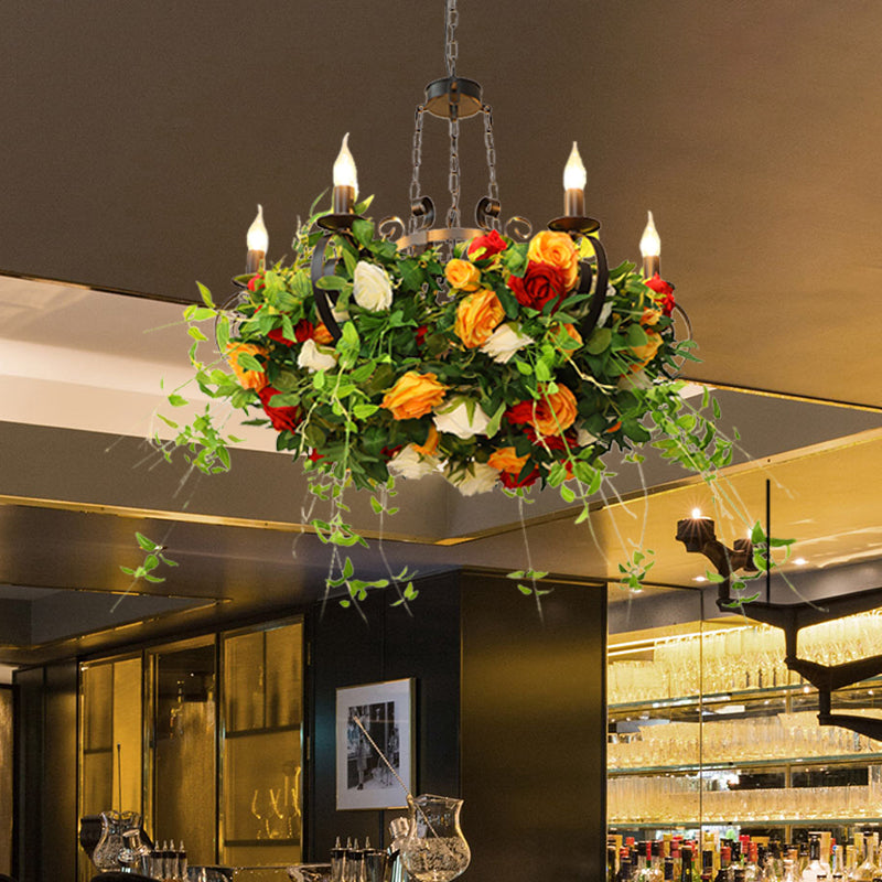 Industrial Metal Black Chandelier with LED Lights and Plant Decor - 6-Light Rose Design