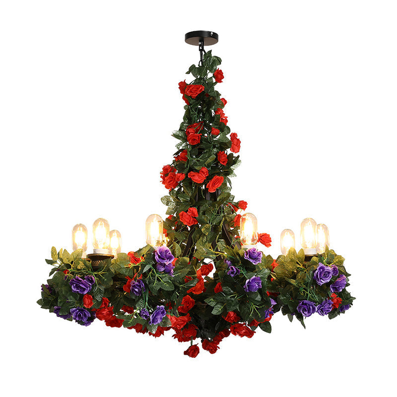 This chandelier light is perfect for industrial-style restaurants. It is made of metal with a green finish and has 10 exposed bulbs. It is suspended from the ceiling by an iron chain. The bulbs are not included.