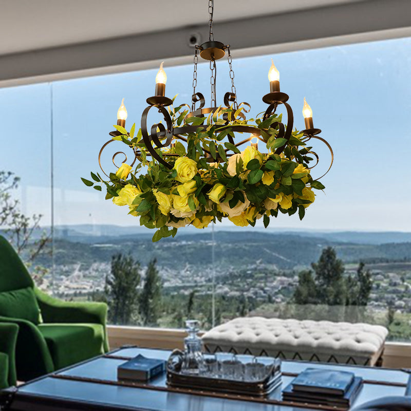 6-Bulb Industrial Black Metal Candle Pendant Chandelier with LED Suspension Lighting and Rose Decoration
