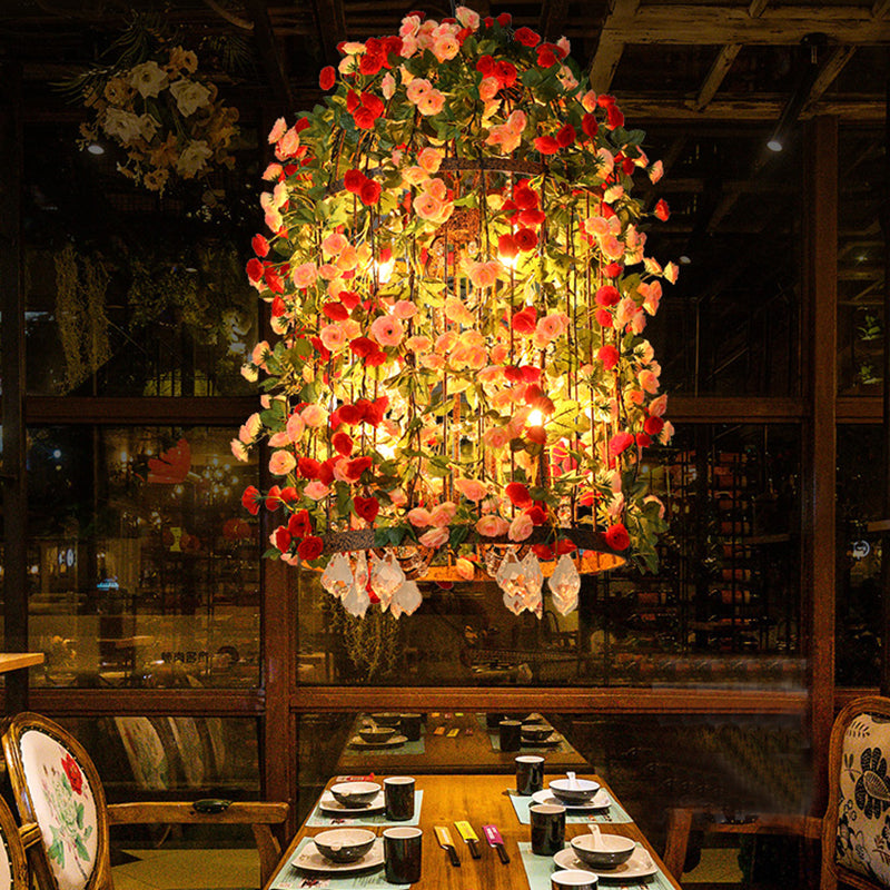 Rustic 8-Bulb Metal Birdcage Chandelier With Led Rose Accent - Crystal Details