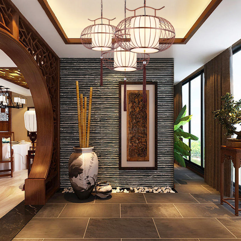 Traditional White/Red Lantern Drop Pendant Ceiling Light for Tea Room - 1 Light, Fabric, 16"/19.5"/23.5" Wide