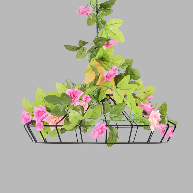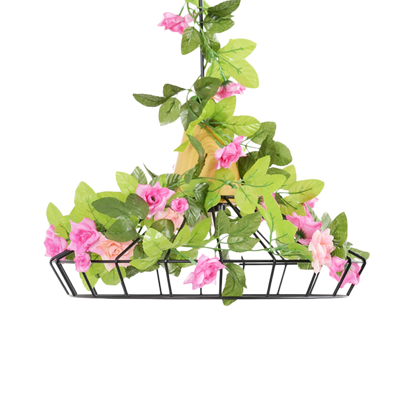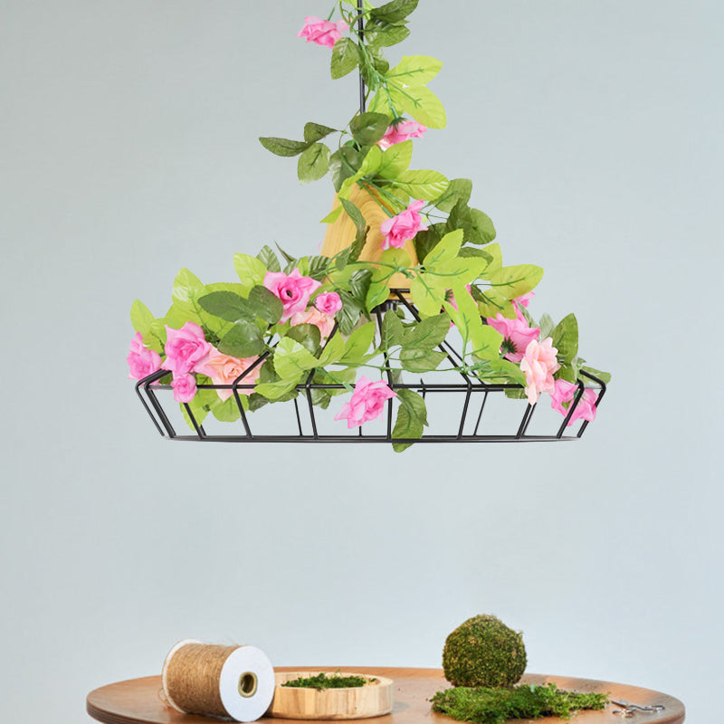 Industrial Black Iron Hanging Light With Diamond Cage Pendant And Wooden Top