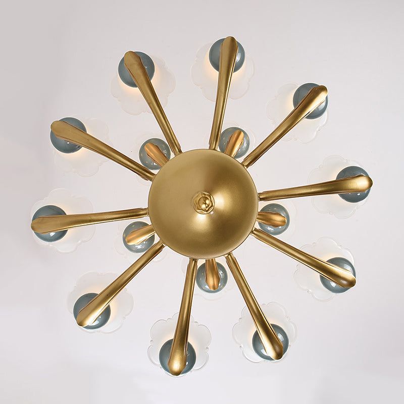 This blue chandelier is a traditional and classic design with a ruffled edge that is perfect for any living room. It is made with metal and has a frosted glass shade that gives off a beautiful and warm light. The chandelier comes with a chain that makes it easy to hang. It is also available in different sizes and has either 6, 8, 10, 12, or 15 lights.