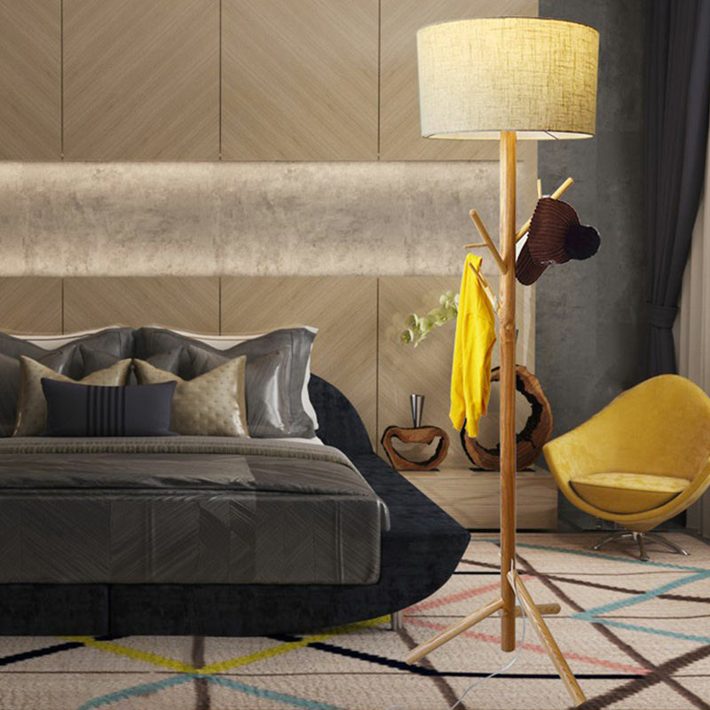 Minimalist Flaxen Drum Stand Up Lamp - Wooden Tripod, 1-Light Fabric Floor Light with Coat Rack