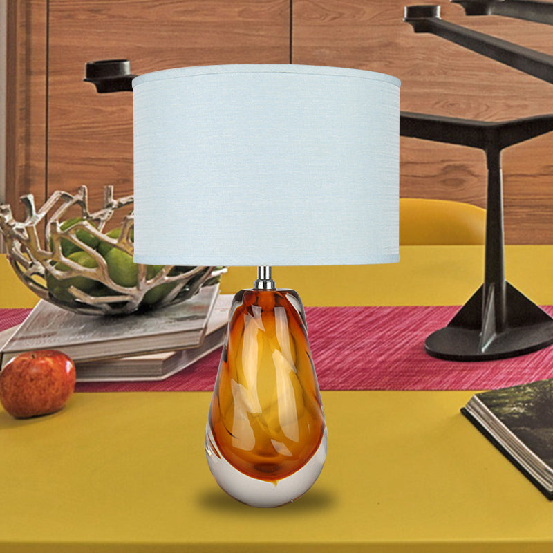 This product is a white drum nightstand lighting contemporary 1 light K9 crystal night light for bedroom. It is made of crystal and has a white finish. The light type is LED/Incandescent/Fluorescent. The voltage is 220V-240V 110V-120V. The bulb base is E26/E27. The fixture width is 14". The fixture height is 21 to 25". The shade material is fabric and the shade color is white. The shade shape is barrel. The bulb is not included.