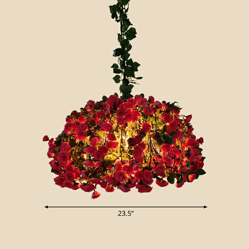Hanging Industrial Cage Pendant Lamp with Artificial Leaf and Flower Accent