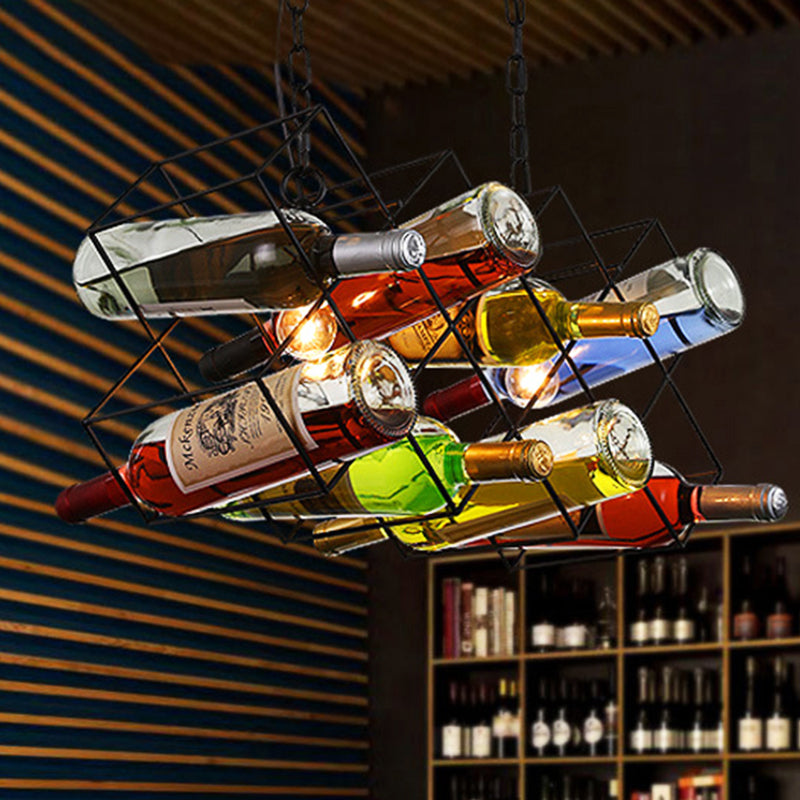 Metal Black Pendant Cage Chandelier With Wine Bottle Accents - Industrial Lighting Fixture