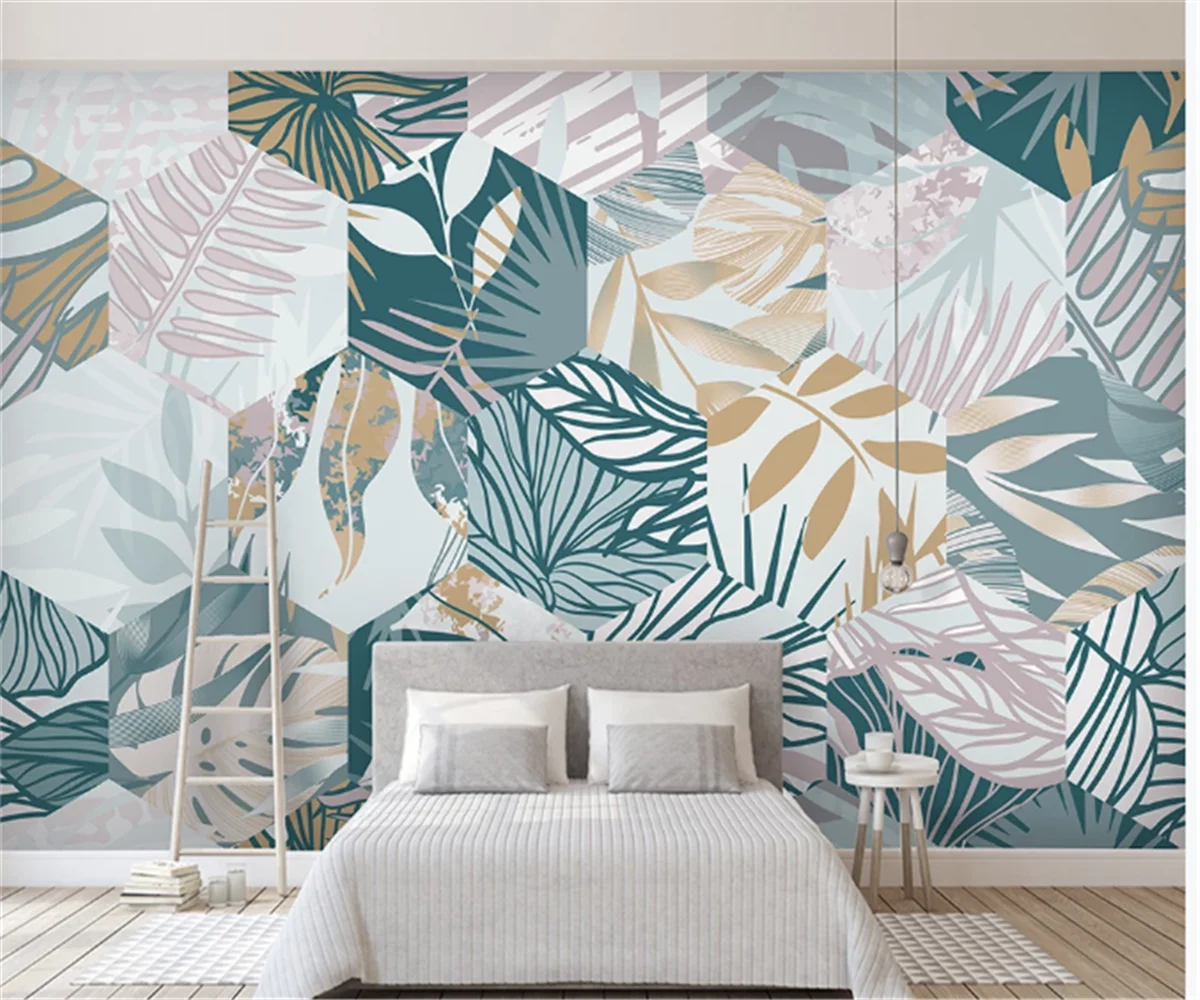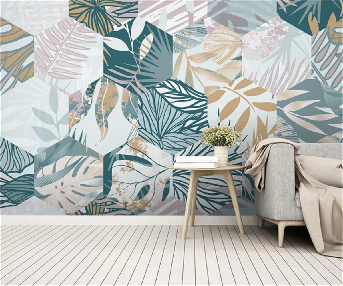 Elevate your interior decor with our Customized 3D Wallpaper Mural, showcasing a captivating fusion of Nordic tropical plant leaves and geometric lines. Crafted from high-quality silk wallpaper material, this mural adds depth and dimension to any space, transforming your TV or bedroom background into a stunning focal point. Ideal for various settings including elders' rooms, living rooms, kids' rooms, studies, and bedding rooms, this wallpaper seamlessly blends entertainment and administration functionalities. With its printed surface treatment and customizable options, including moisture-proof, smoke-proof, and waterproof features, it offers practicality without compromising style. The anti-static and heat insulation properties ensure a comfortable and inviting ambiance. Choose this wallpaper to enjoy its 3D effect, mildew resistance, extra thickness, water resistance, and eco-friendly composition, making it a stylish and sustainable choice for your home decor.