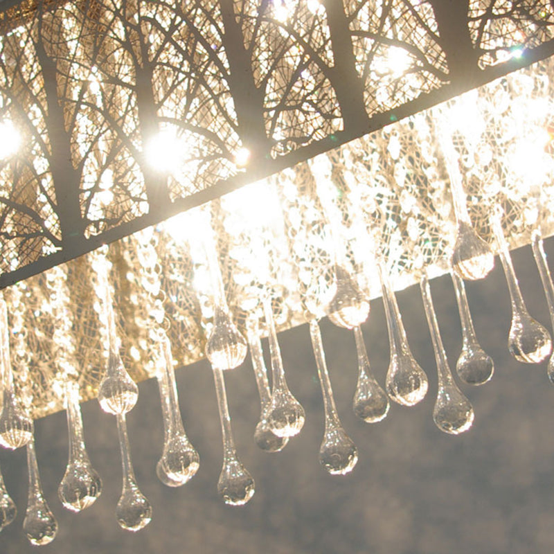 Ce produit est un luminaire d'îlot rectangulaire blanc au design moderne. Il possède 3 têtes et est fabriqué avec du cristal en forme de goutte d'eau et un motif forestier. La lumière est LED et la tension est de 220 V-240 V 110 V-120 V. Le culot de l'ampoule est E12/E14.