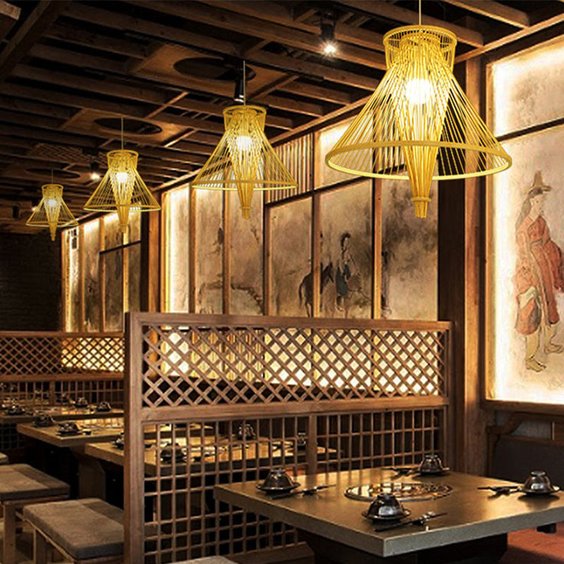 Retro Bamboo Cone Pendant Light Kit - Wood Suspension Lamp For Guesthouse