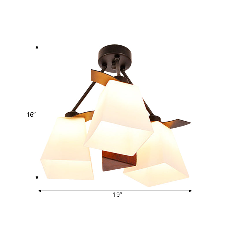 Trapezoid Semi Flush Ceiling Lamp With White Glass And Wood Cylinder Shade - 3/5 Lights / A