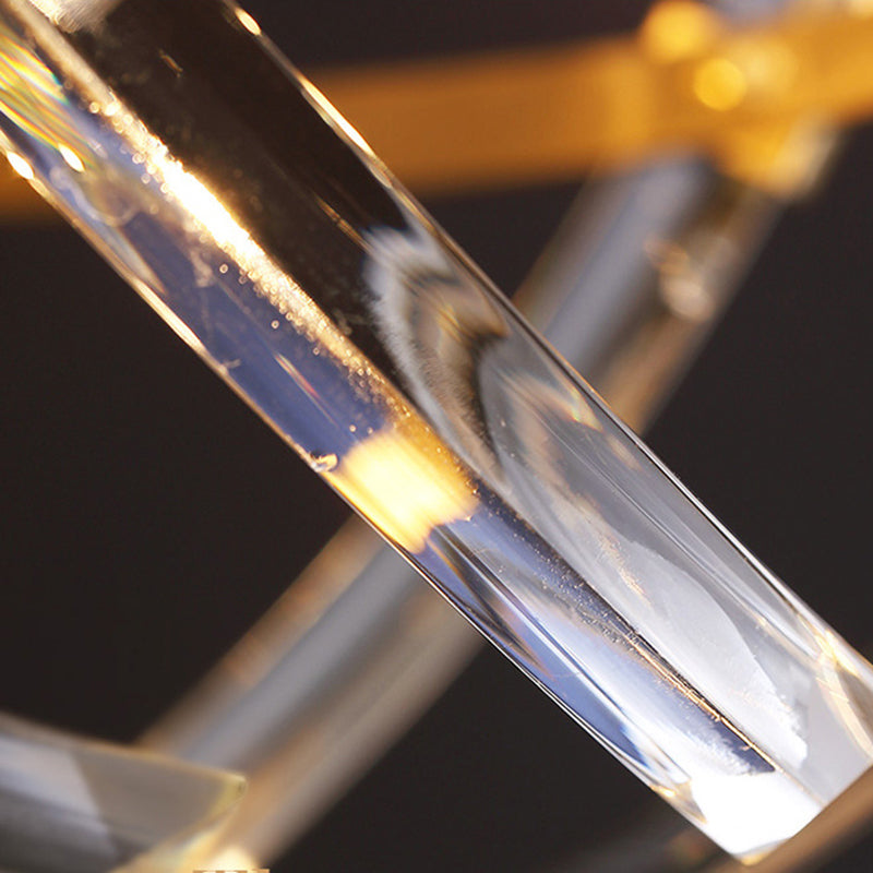 This product is a 6-head chandelier lamp with a modern gold hanging light and an orbit curved crystal rod shade. It is made of crystal and is voltage 220V-240V 110V-120V. The bulb base is E12/E14 and the light type is LED.
