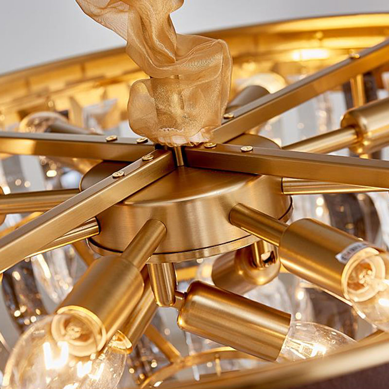 This is a cone contoured crystal pendant chandelier that is contemporary and has 11 heads. The chandelier is brown and the suspension light is clear. The voltage is 110V-120V 220V-240V. The bulb base is E12/E14. The light type is LED/Incandescent/Fluorescent.
