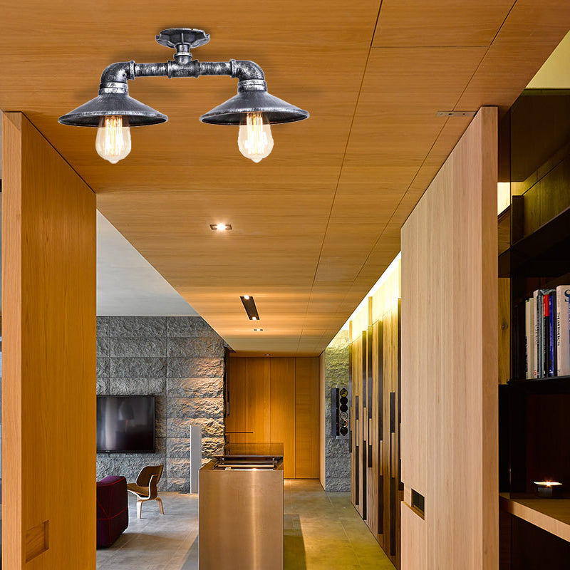 Wrought Iron Saucer Semi Flush Light - Retro Industrial Style 2 Lights Living Room Ceiling Mount In