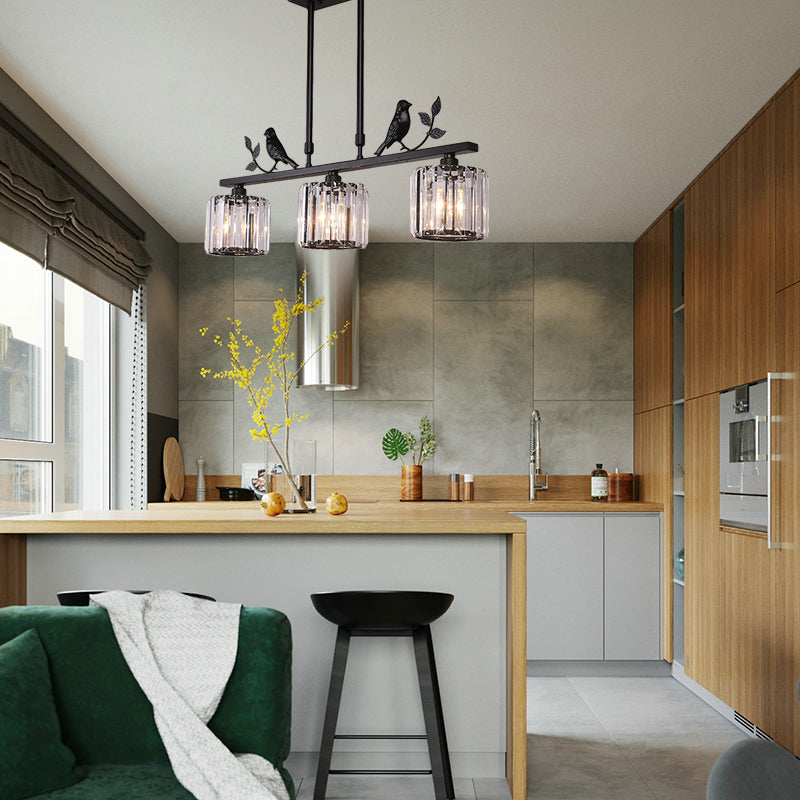 Modern Black/Gold Chandelier Lamp with Clear Crystal Drum Shade, Bird Accent - 3 Heads Hanging Light Fixture