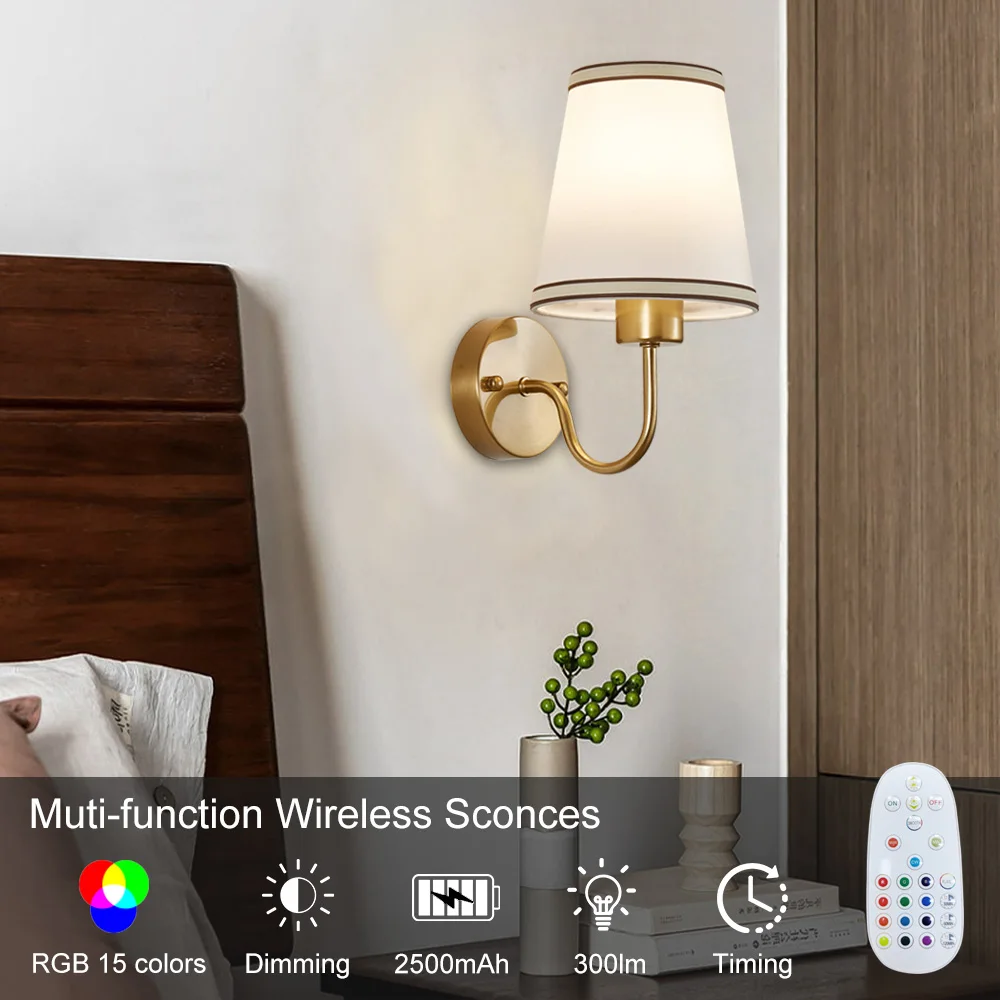 Battery Operated Wall Sconces Set of 2,Gold Wireless Wall Sconces with Remote,15 Colors Modes Rechargeable Wall lamp for Bedroom Living Room