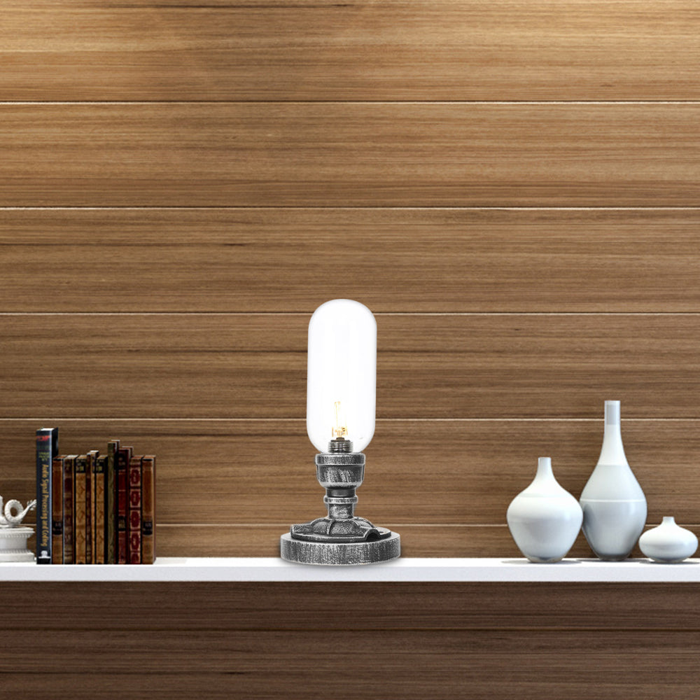 Antique Silver Industrial Desk Lamp with Clear/Amber Glass Capsule Shade and Curved Arm