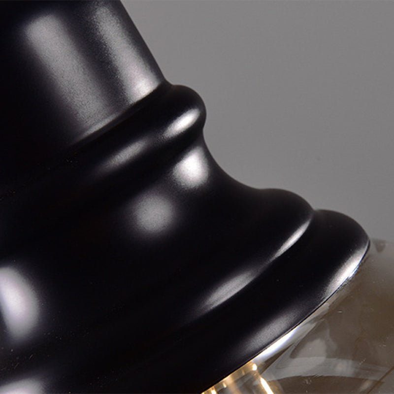 This product is a Black Shaded Pendant Lighting Fixture with a Minimalist Style Glass Hanging Ceiling Light. The product is made of metal and glass, has a black finish, and comes with a clear glass shade. The shade is amber in color and has a drum jar shape. The fixture is industrial in style, has one light, and is suspended from a 23.5" chain/cord. The light bulb is not included. This fixture is ideal for indoor use and is compatible with LED, incandescent, and fluorescent bulbs.