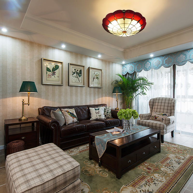 Tiffany Style Bedroom Ceiling Light 12/16/19.5 W Dome Shade Flush Mount With Red Jewel Decoration