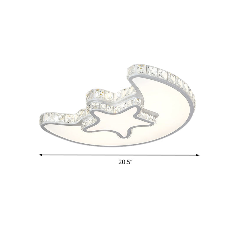 This LED Bedroom Ceiling Light Fixture is a modern white flush mount with a star moon crystal shade. The size is 15 to 19 inches, the length is 20.5 inches, the fixture width is 16.5 inches, and the fixture height is 3 inches. The bulb is included and it has a color temperature of white. The fixture type is flushmount, the material is crystal, the maximum bulb wattage is 39 watts and under, and the light type is LED.