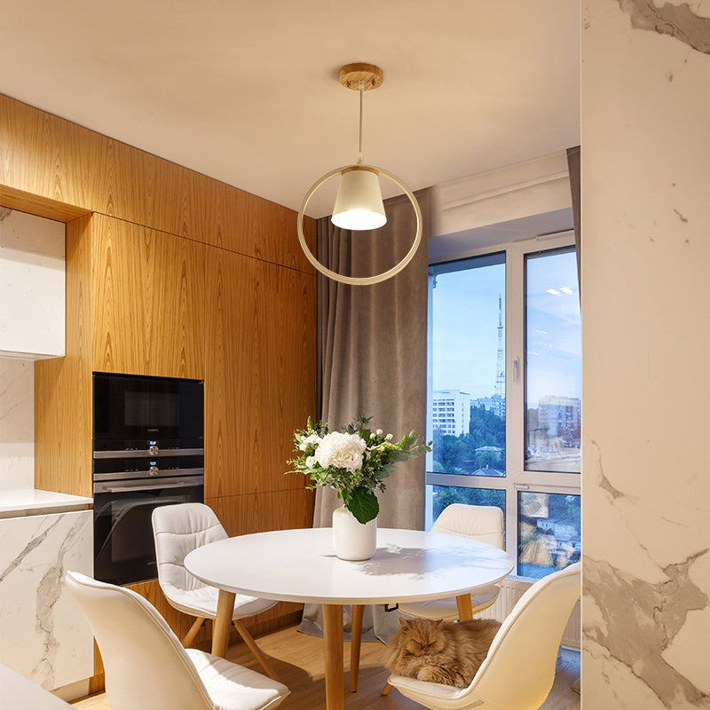 This product is a metal ring semi flushmount light fixture with a conic shade. It is a minimalism 1 light ceiling flush mount light. It is perfect for your kitchen. This product is available in white. It is made of metal and has a voltage of 220V-240V 110V-120V. The bulb base is E26/E27. The light type is LED/Incandescent/Fluorescent.