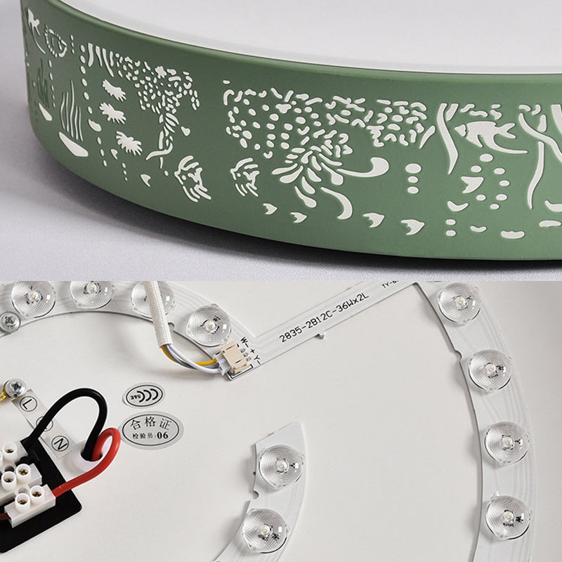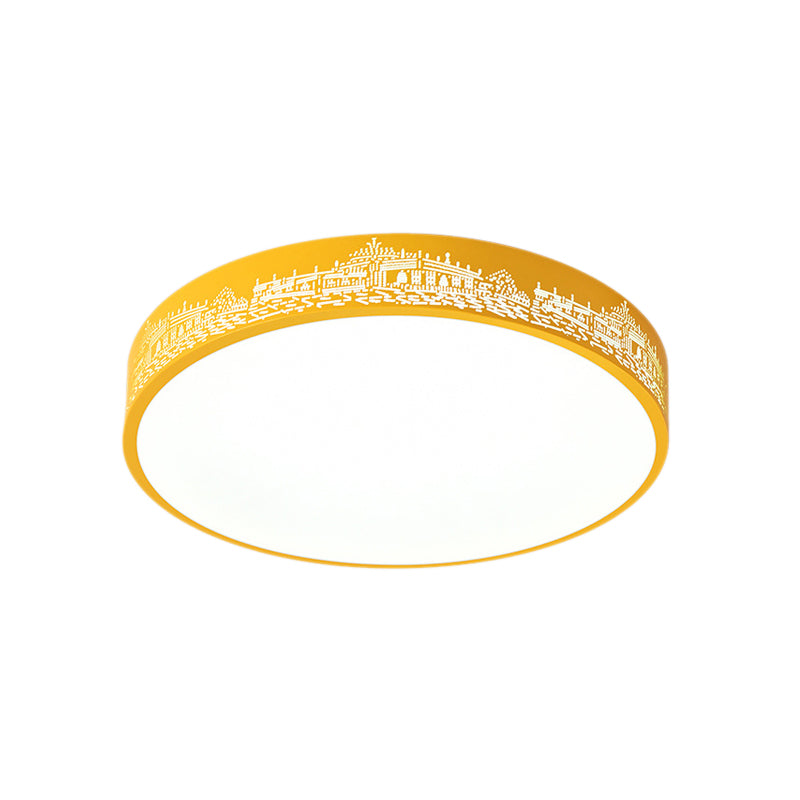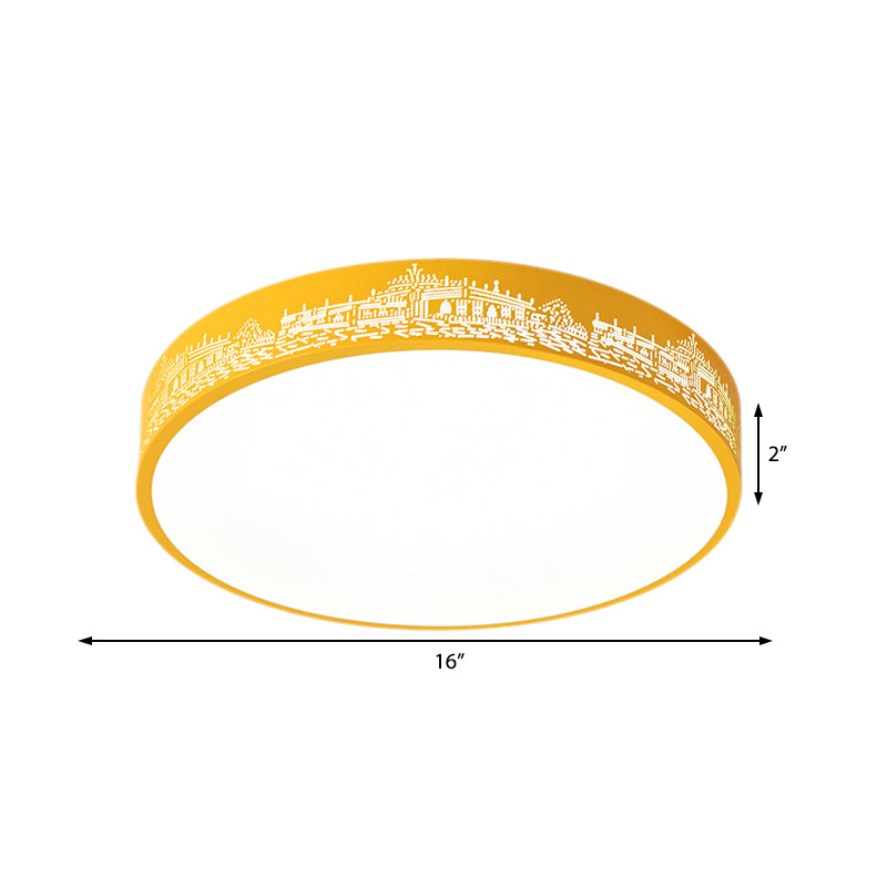 This is a LED flushmount ceiling light with a modern cityscape acrylic diffuser. The light is available in green, pink, and yellow, and it would be perfect for a nursery or child's room. The light is 12 inches wide and 16 inches long, and it is 3 inches high. The light has a maximum wattage of 39 watts. It is made of metal and is available in three different voltages: 110V-120V, 220V-240V, and 240V-277V. The light's base is an SMD LED.