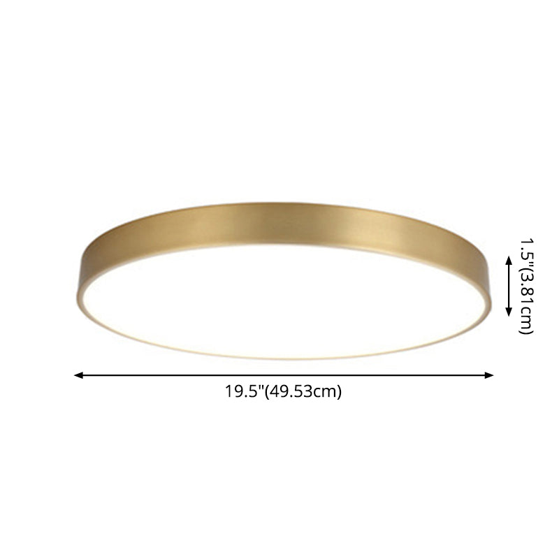 This product is a round flush mount ceiling light made from metal. It is a minimalist flush mount ceiling light, ideal for bedrooms. It has a white shade made from acrylic, and it uses LED bulbs. It is available in three sizes: 12", 16", and 19.5". The width and height of the fixture are the same as the size of the light. The light comes with a bulbs included. The color temperature is "Third Gear," and the maximum bulb wattage is 39 watts. It is also available in a voltage of 110V-120V 220V-240V.