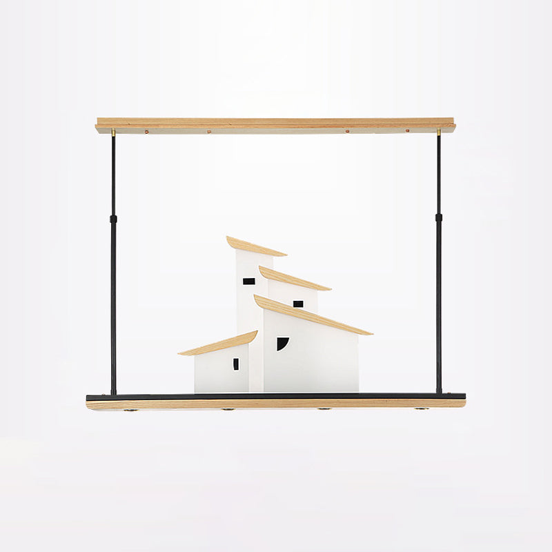 Art Deco Island Pendant Ceiling Light, LED Metal Fixture in White with Wood Bracket - Warm/White Light