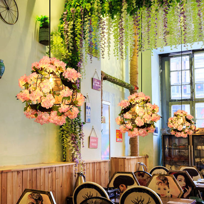 Industrial LED Drop Lamp Pendant - Metal Black Orb, 12"/16" Diameter, 1 Head, Cherry Blossom Design