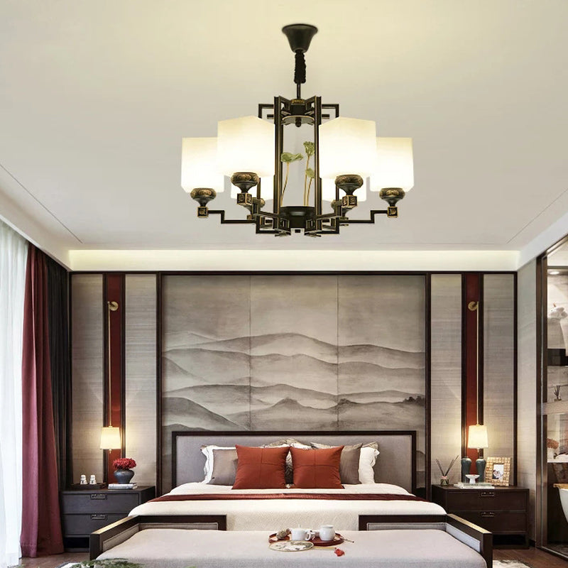 This product is a traditional style metal chandelier that is available in either 6, 8, or 10 light options. It is a dining room pendant light that comes in black. The chandelier has a frosted glass shade and is made with metal. The voltage for this product is 220V-240V or 110V-120V. The light type is either LED, incandescent, or fluorescent.
