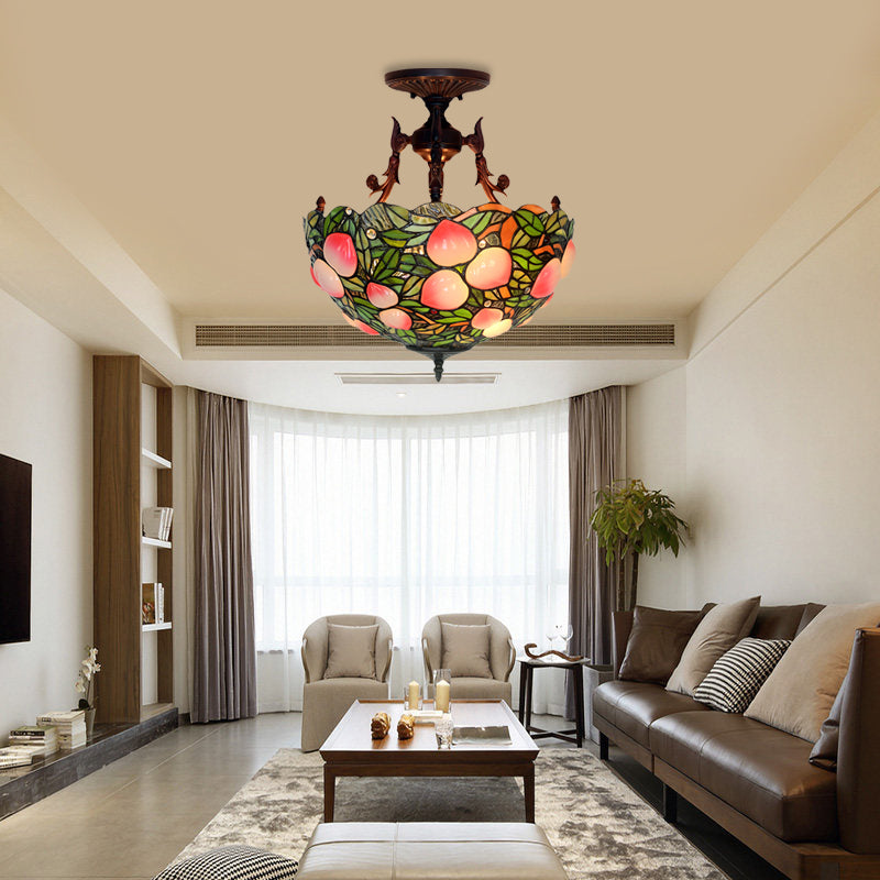 Victorian Semi Flush Stained Glass Ceiling Lamp for Bedroom - 3-Head Green/Pink Grape/Peach Pattern