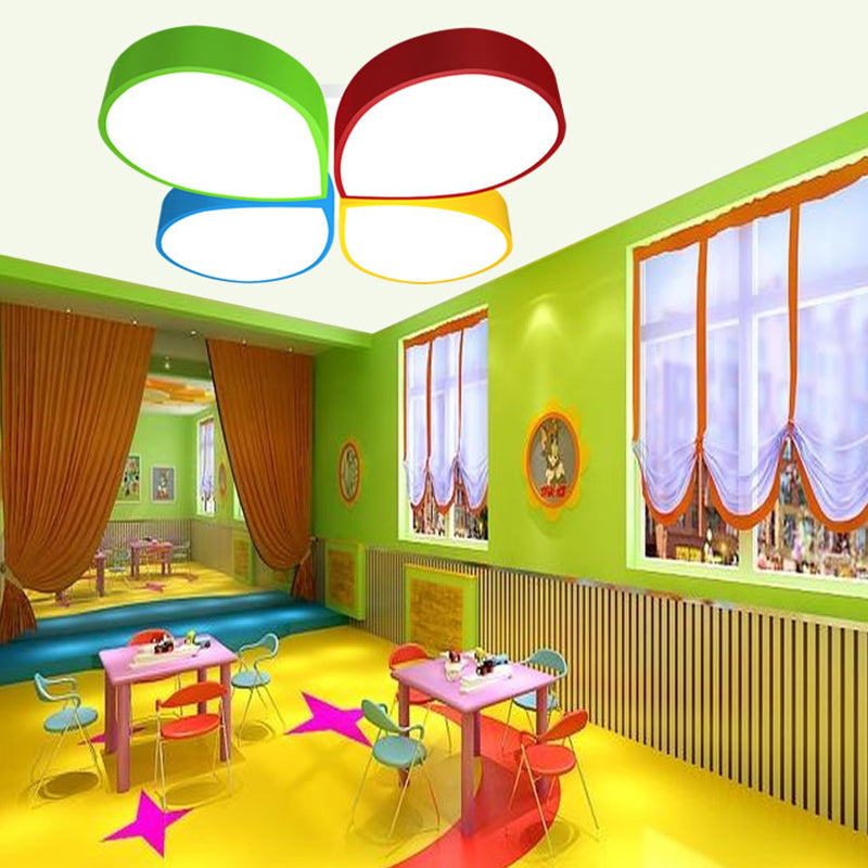This product is a 23.5"/35.5" W Macaron 4-Petal Flower Ceiling Flush Metallic Kindergarten LED Flush Mount Lamp in Red-Yellow-Blue-Green, White/3 Color Light. It is made of acrylic and has a voltage of 110V-120V 220V-240V. The light type is LED.
