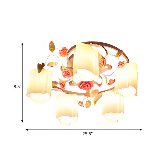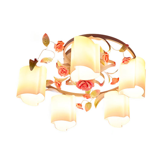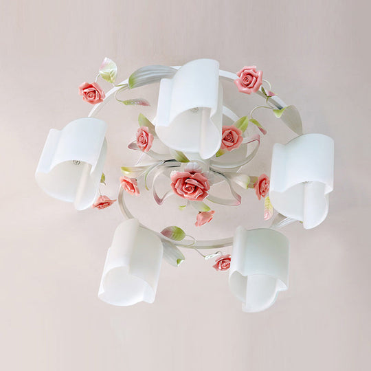 Romantic Pastoral Floral Ceiling Flush Chandelier - 3/5-Head, White/Yellow with Frosted Glass - Semi Flush Mount