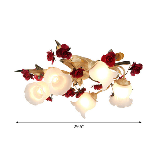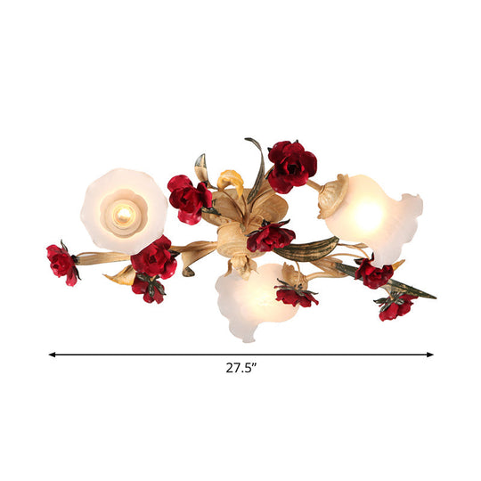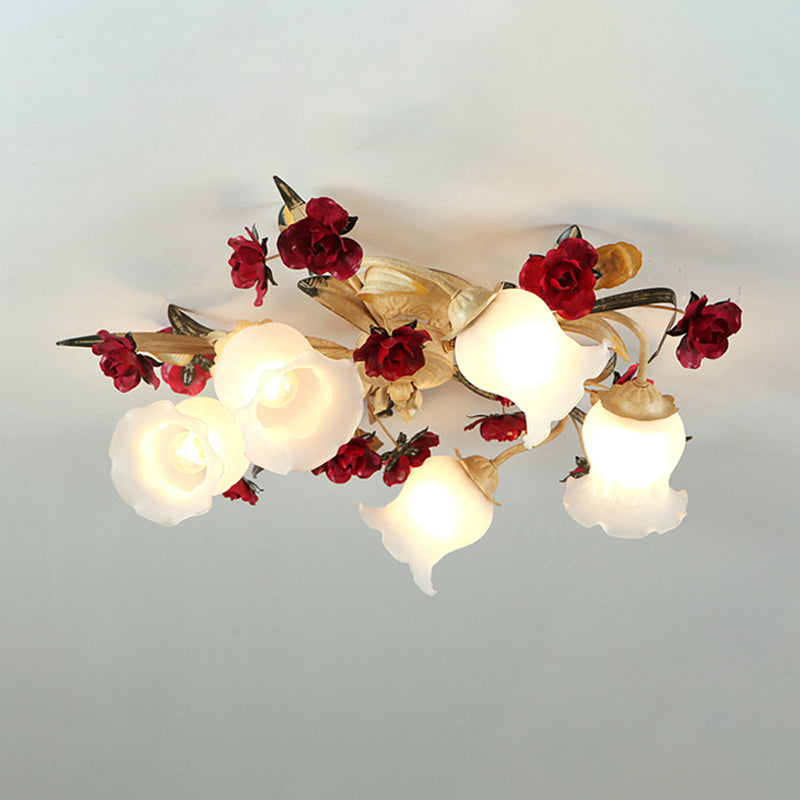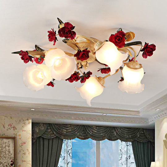 Romantic Pastoral Living Room Semi Flush Mount with Flower Frosted Glass Shade in White - 3/5-Light Flush Lamp