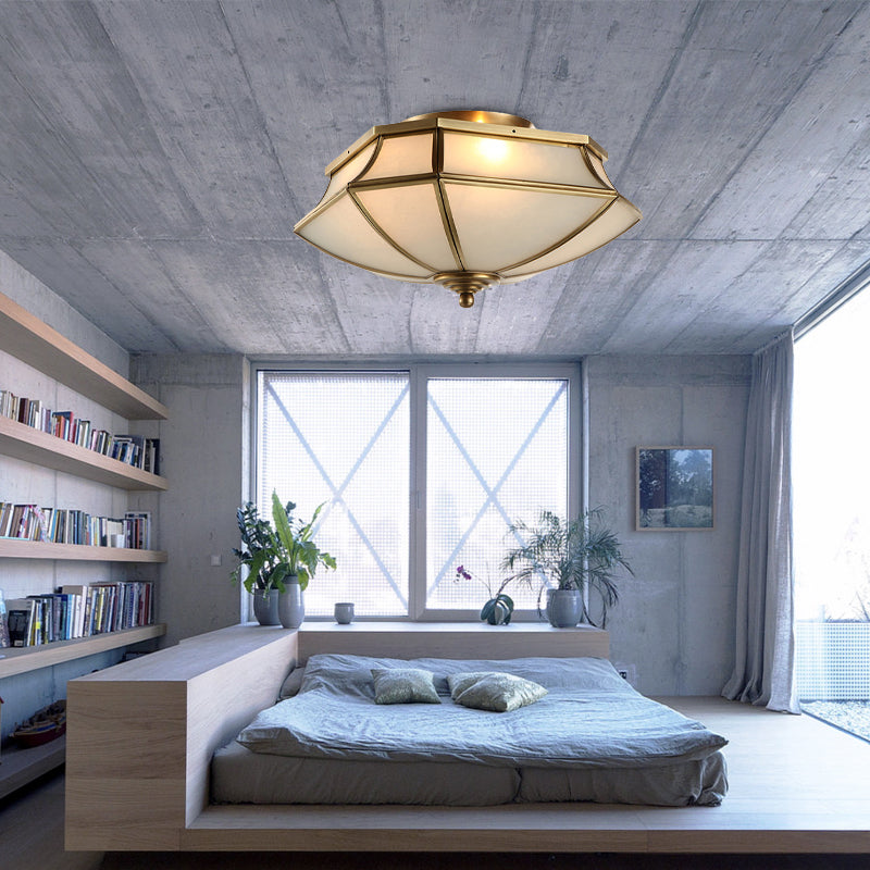 Classic Brass Beveled Ceiling Lamp With Opal Glass Shade - 3-Light Flush Mount