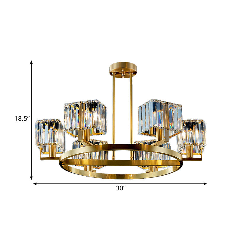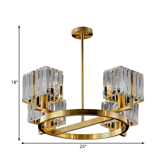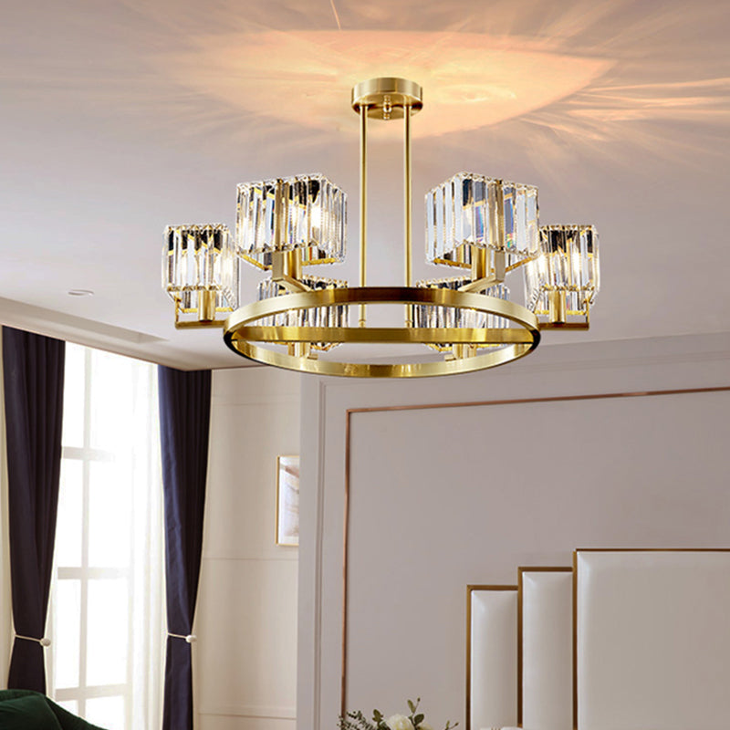 Modern Gold Semi Flush Chandelier With Crystal Cubic Shade - 4/6 Bulbs Ring Frame Mount Lighting