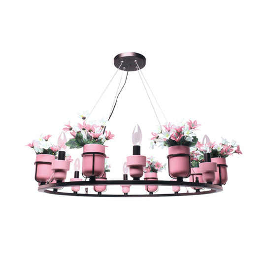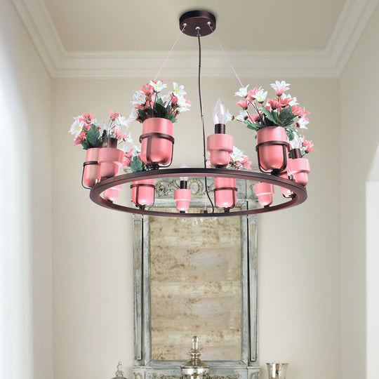 Industrial Ceramic Hanging Chandelier with Potted Plant Design - 6/8 Lights - Pink/Blue Circular Pendant Ceiling Light