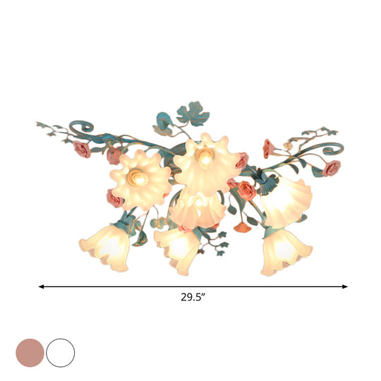 Korean Garden Flower Frosted Glass Semi Flush Mount Ceiling Light - 7/9 Lights White/Pink