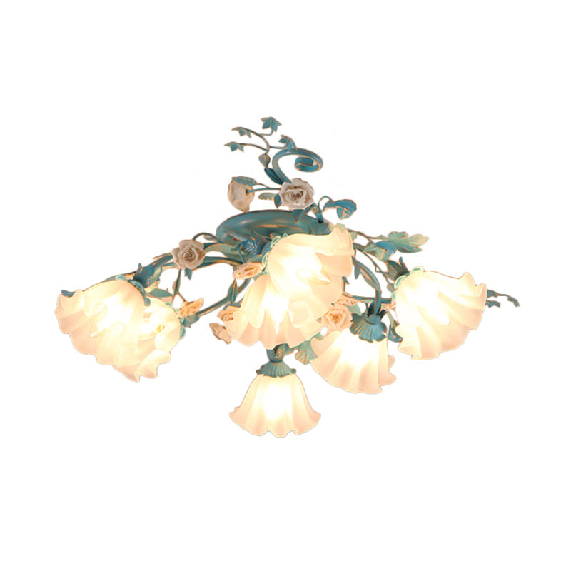 Korean Garden Flower Frosted Glass Semi Flush Mount Ceiling Light - 7/9 Lights White/Pink 7 / White