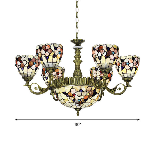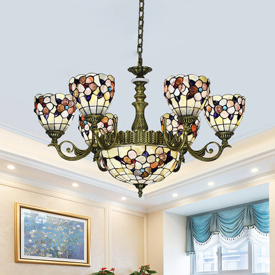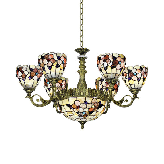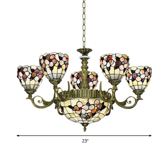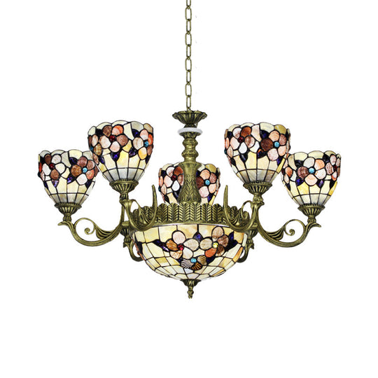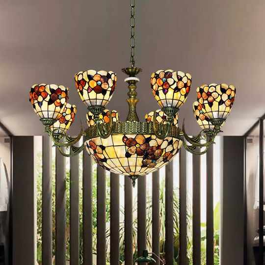 Tiffany Beige Flower Pattern Chandelier for Bedroom, 9/11 Lights, Ceiling Suspension Lamp with Bowl Shell Shade