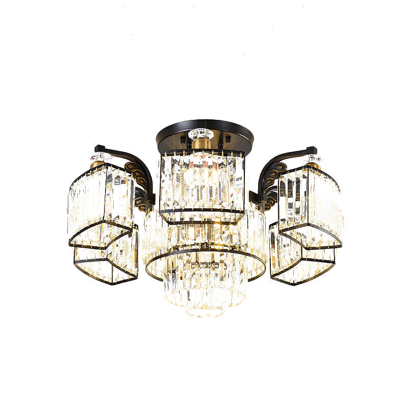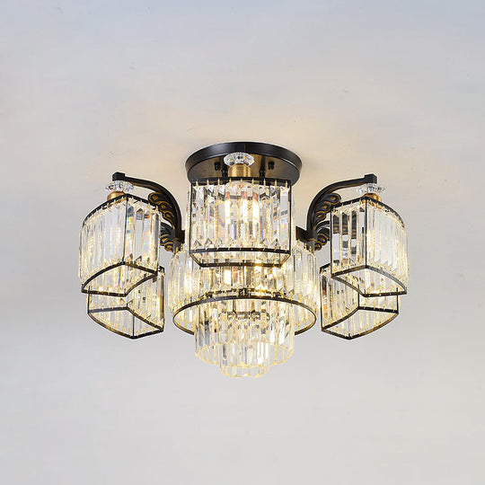Modern Black Bedroom Flushmount With Crystal Block Shade - Semi-Flush 9/12 Head Design