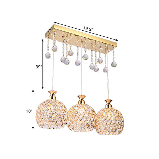 Introducing the "Ball Crystal Encrusted Multi Pendant Contemporary 3 Bulbs Gold Finish Hanging Lighting"! This magnificent eye-catching pendant light is perfect for making a statement in any room. Adding an element of elegance and glamour, it will bring your home to the next level. Measuring 19 to 20 inches in size with a chain/cord length of 39", this light could be hung in your living room, kitchen, hallway or bedroom. It also features a shade height of 10 inches, canopy width of 19.5 inches, and a canopy shape of linear.